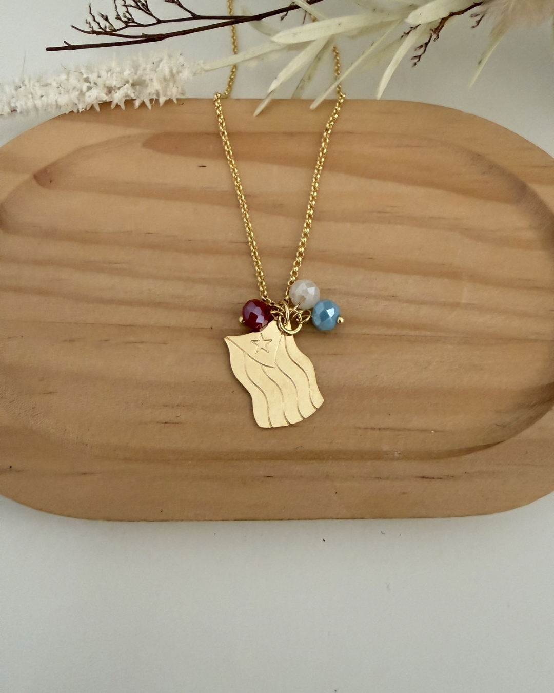 Cadena en baño de oro 18 de excelente calidad. Mide aproximadamente 16”. Charms en baño de oro y detalles en cristales rojo, blanco y azul alusivos a los colores de la bandera.
