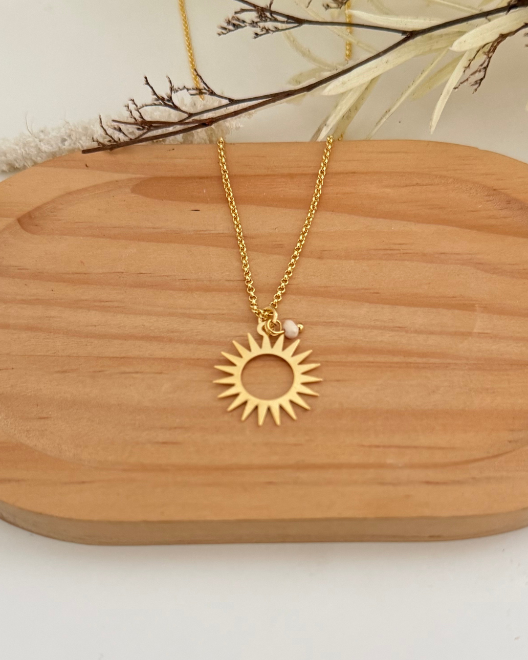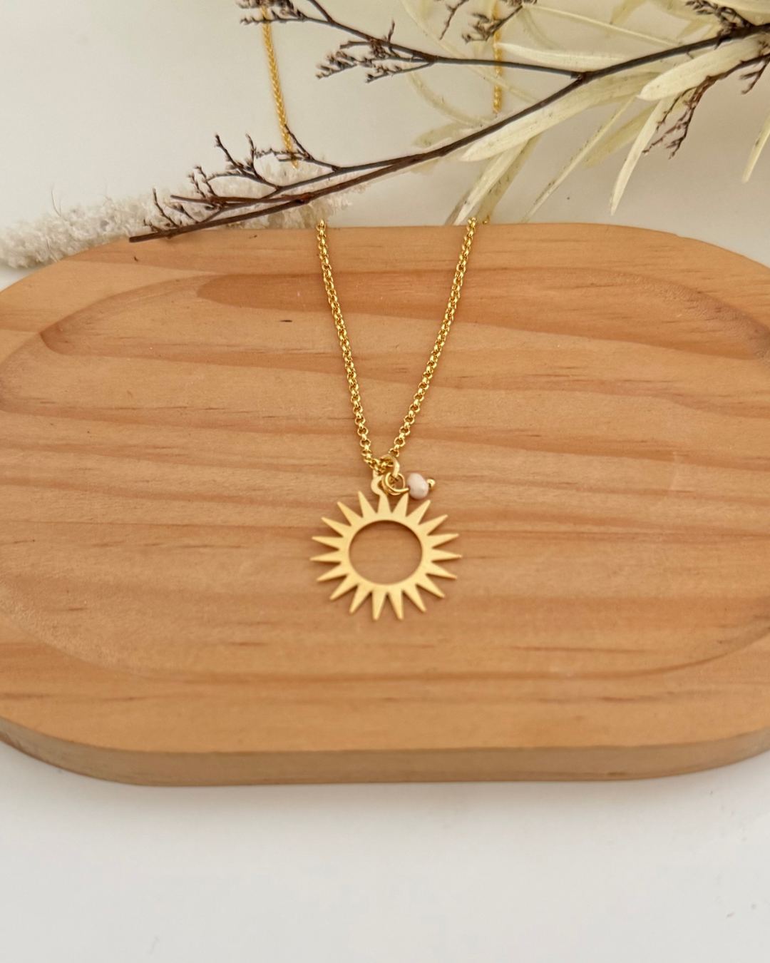 Cadena en baño de oro 18 con el sol diseñado de nuestro logo( nuestra marca) . Aproximadamente mide 16” detalles en perlas.