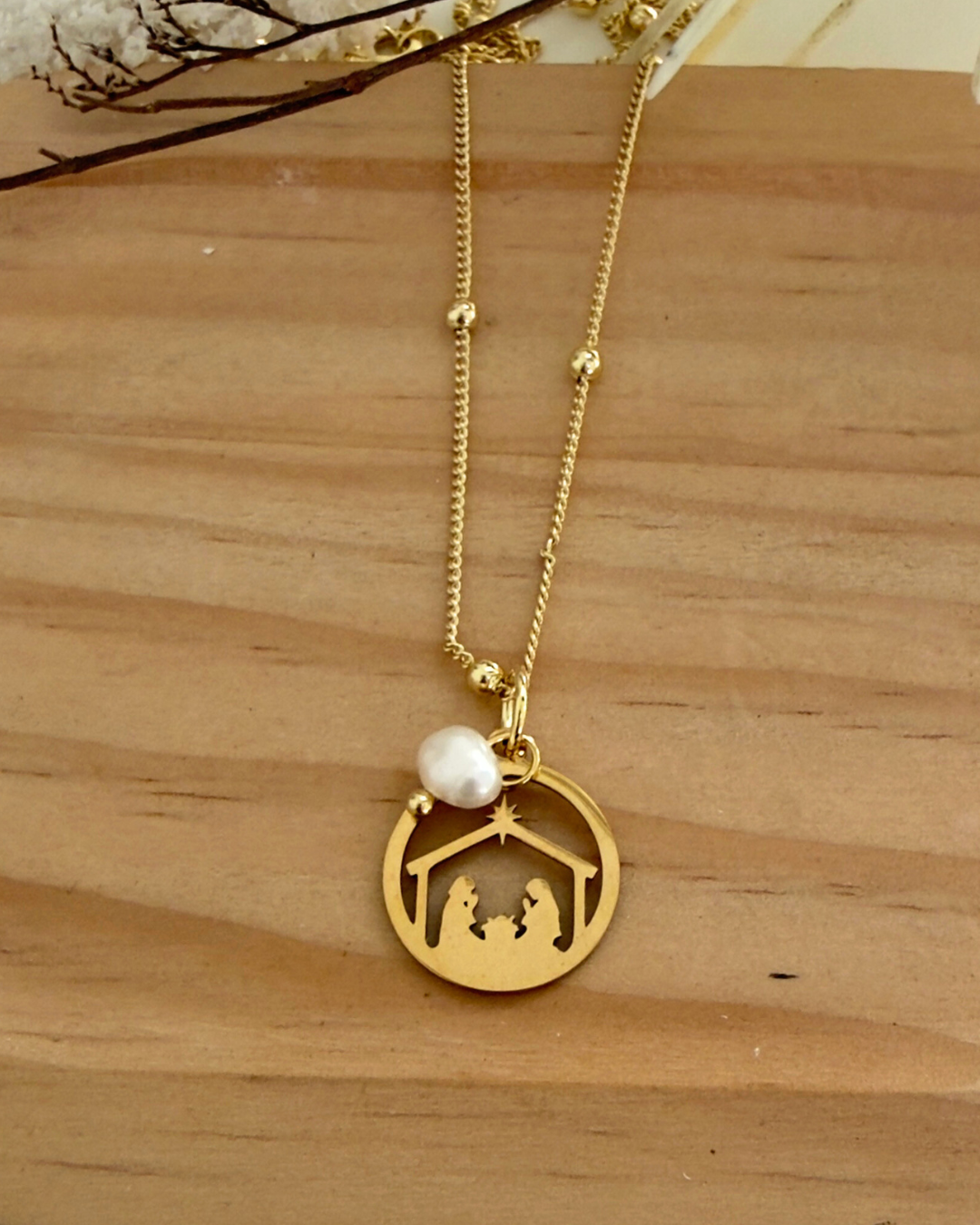 Cadena en baño de oro y stainless steel. Nacimiento pequeño. Detalle en perla alambrado. Mide aproximadamente 16” de largo.