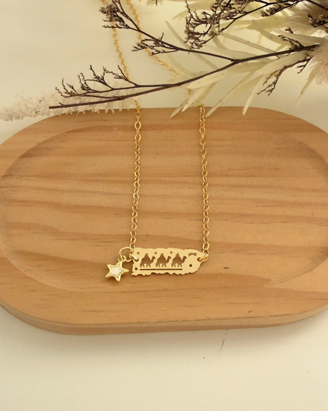Cadena mide aproximadamente 16” en baño de oro 18. Excelente calidad. Mapa de PR con los Reyes y estrella blanca significa ( estrella de oriente).