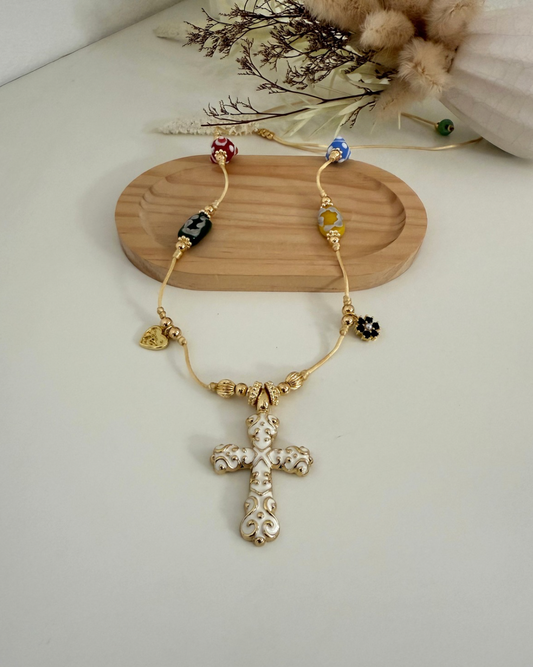 Cruz blanca y dorada grande, charm dorado en forma de corazón con la palabra fé.