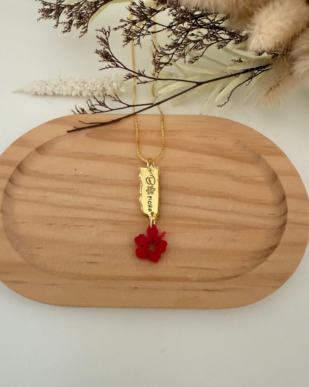 Mapa acrílico dorado con la palabra Boricua. Amapola roja acrílica pequeña.