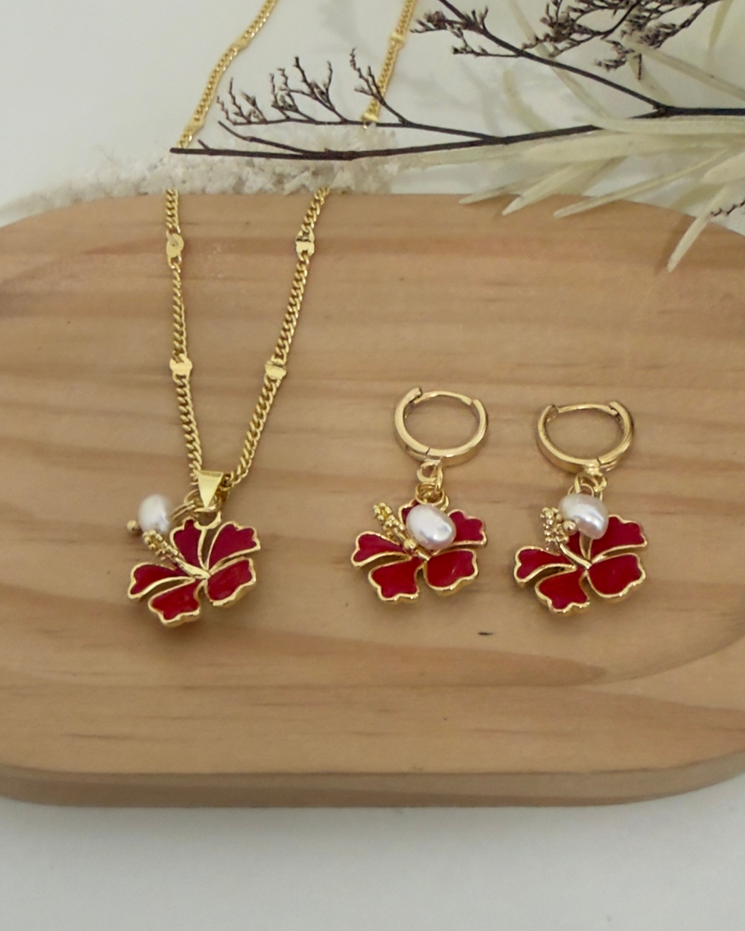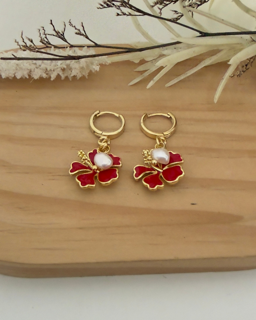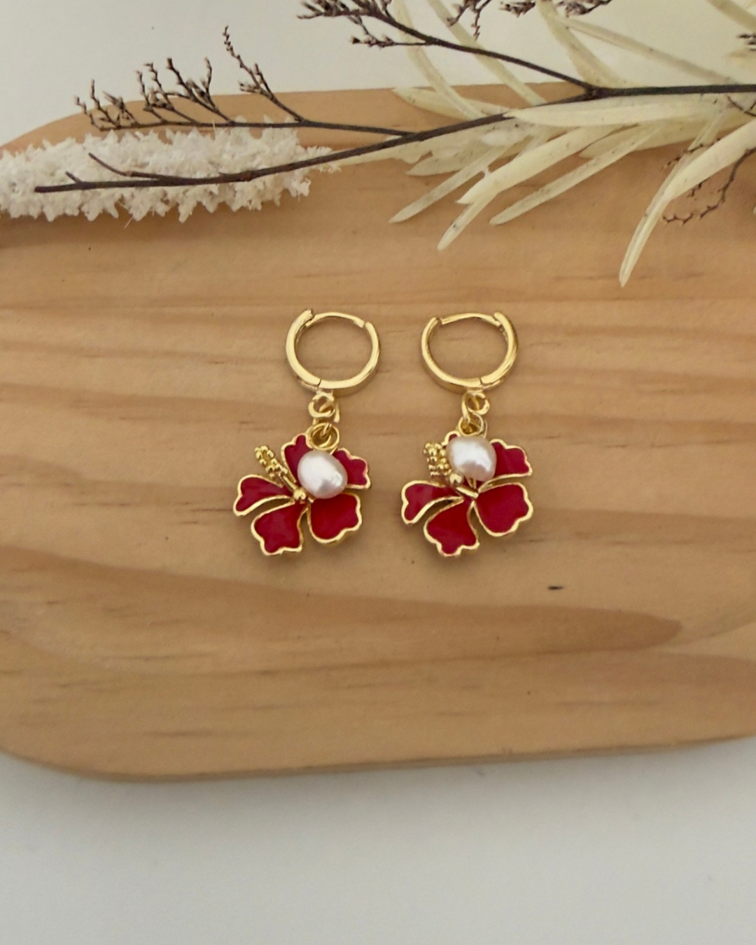 Pantallas de Amapola roja esmaltada. Con detalle de perla alambrada. Argollas pequeña dorada en stainless steel y baño de oro.