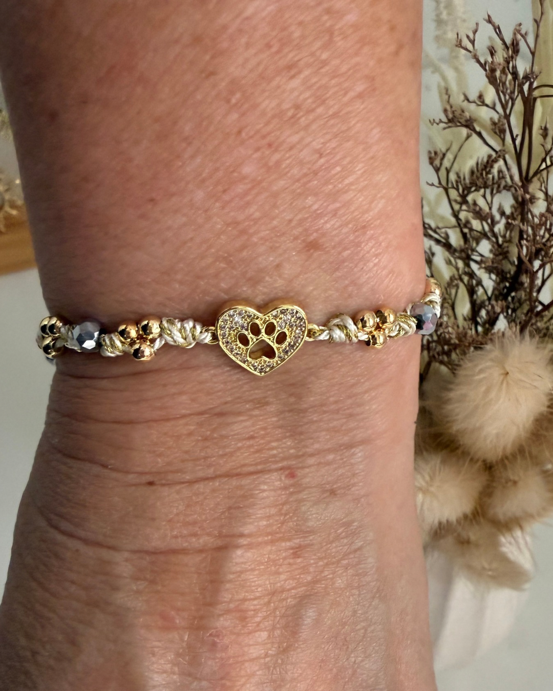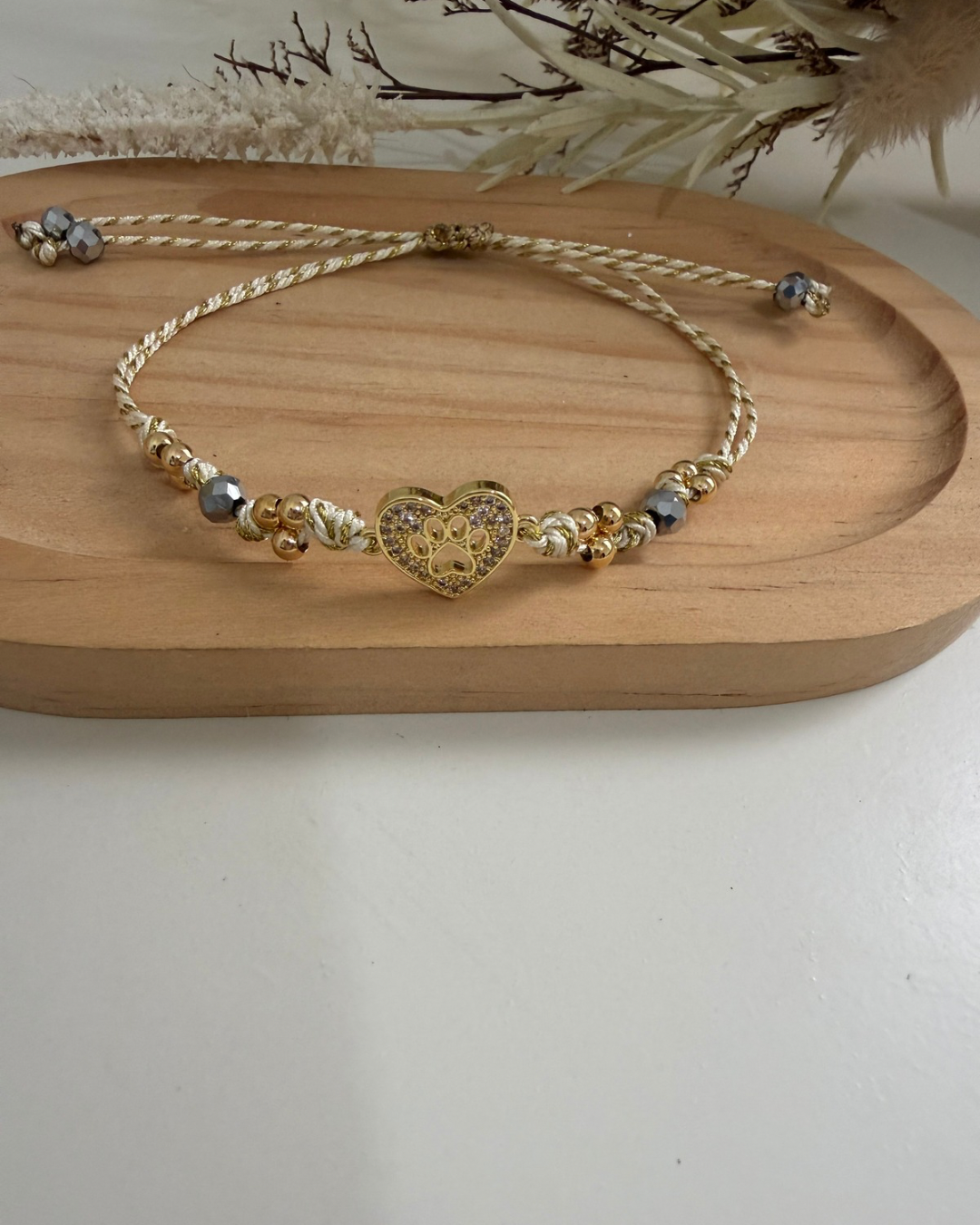 Pulsera en hilo crema y dorado con cristal plata. Balines en baño de oro 18. Son ajustables. Corazón y huella de perro. Hecha a mano.