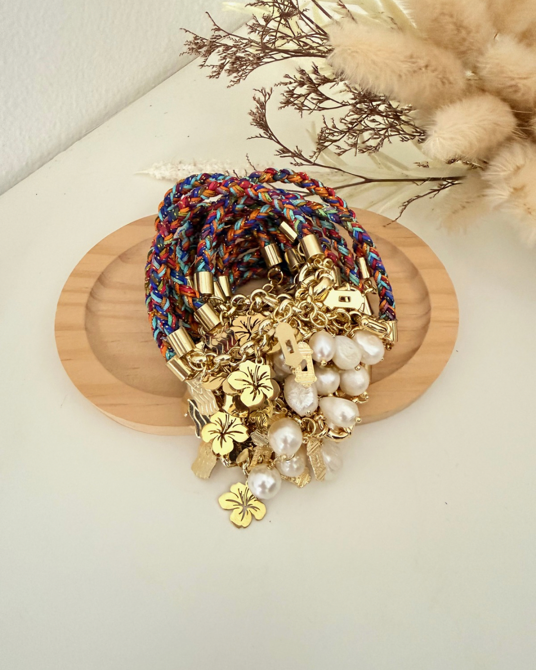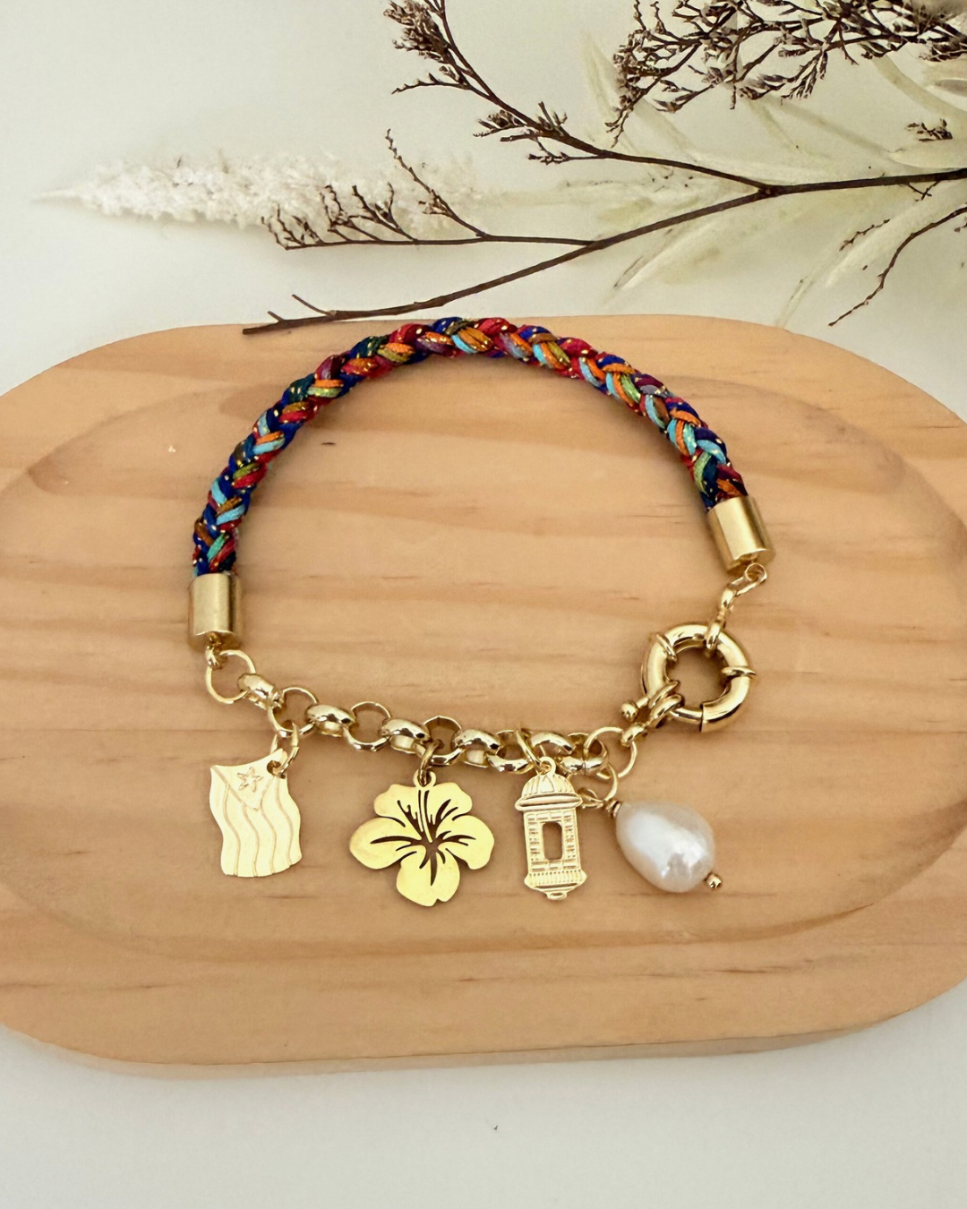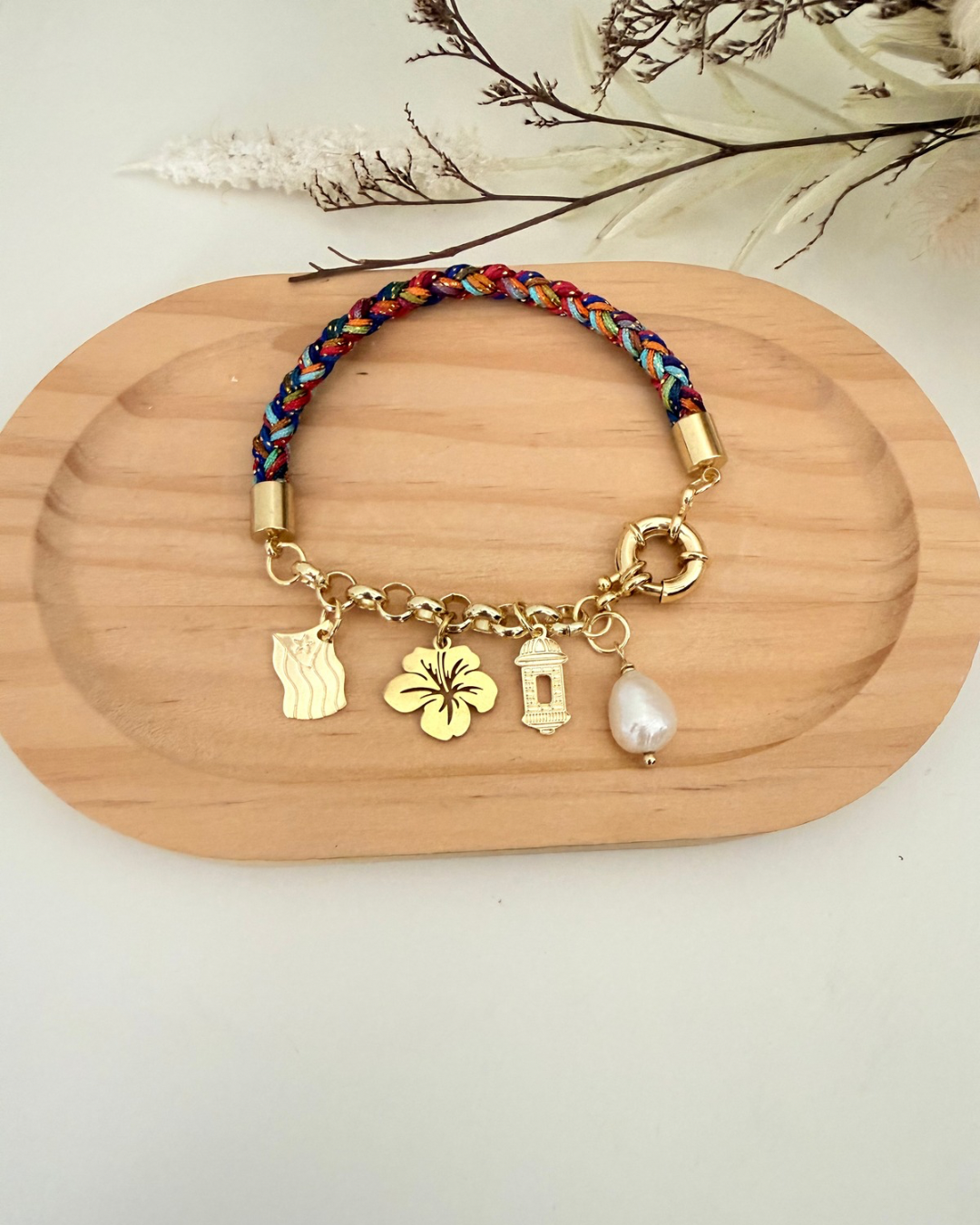 Pulseras hechas a mano en hilo de colores vibrantes con cadena en baño de oro y charms colgantes de motivo de PR.