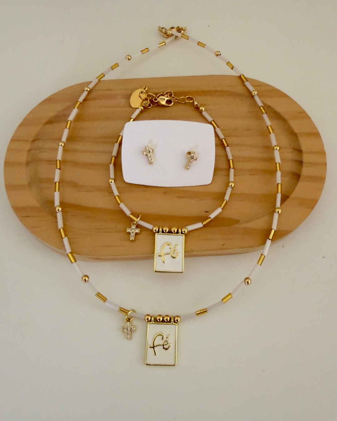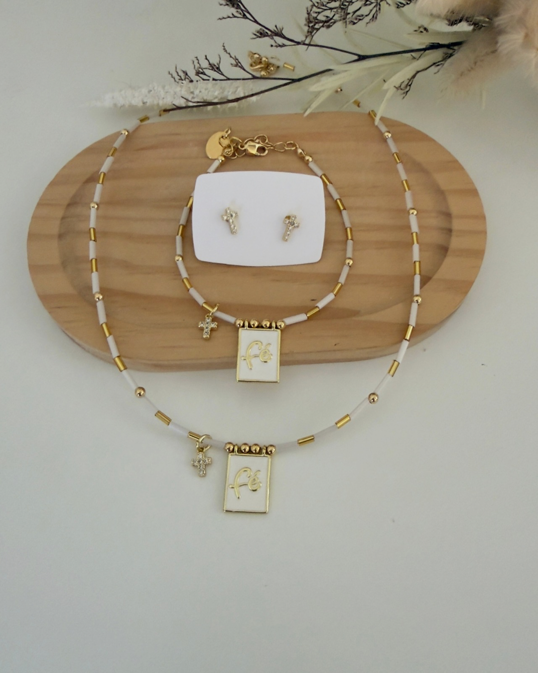 Collar y pulsera hechas a mano en seebeads blancos y dorados. Detalles dorados y charms blanco esmaltado y bordes dorados. Detalles de cruz en zirconias.